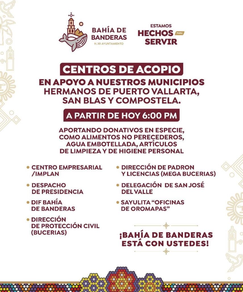 Ante las afectaciones ocasionadas por las intensas lluvias registradas el pasado sábado 11 de octubre en el municipio de Puerto Vallarta, San Blas y Compostela, el Gobierno de Bahía de Banderas, que encabeza el presidente municipal Héctor Santana, convoca a la ciudadanía y a las dependencias municipales a sumarse con espíritu solidario a una campaña de acopio de víveres y donativos en especie en apoyo a las familias vallartenses.