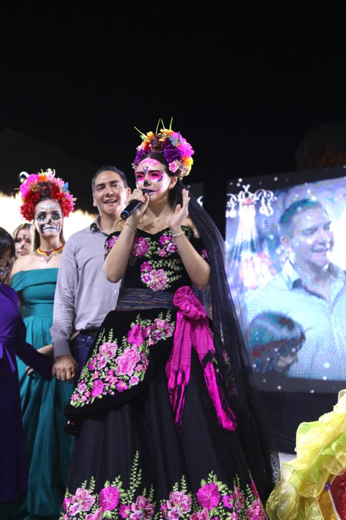 Ganadoras del Concurso de Catrinas:• Tercer lugar: Rachel Hernández deslumbró con un vestido negro de corte sirena decorado con flores de cempasúchil elaboradas a partir de papel maché y periódico. La parte inferior del vestido, cuidadosamente cubierta con recortes de periódico, añadía un toque artesanal a su caracterización. • Segundo lugar: Samantha Bautista capturó las miradas con su vestido amplio de color amarillo, adornado con un “ojo de Dios” en tonos verde, rojo y azul. Complementó su look con una corona que realzaba su presencia en el escenario. • Primer lugar y premio de 10 mil pesos: Doria Herrera se llevó el primer premio con su impresionante catrina monarca, una creación diseñada por Ulises González. Su vestido negro, con mariposas monarca en 3D y un tocado de flores de cempasúchil, dejaba una impresión inolvidable.