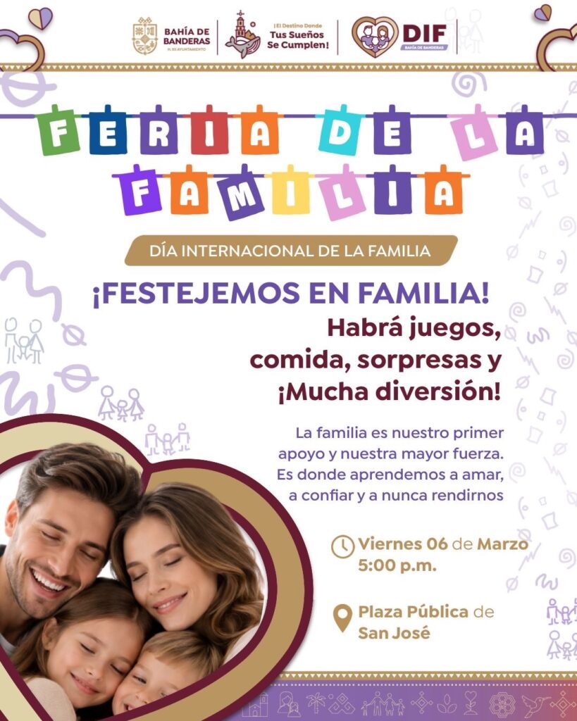 Con el objetivo de fortalecer la convivencia y celebrar el valor de la unión familiar, el Gobierno Municipal de Bahía de Banderas, que encabeza el presidente municipal Héctor Santana, a través del Sistema DIF de Bahía de Banderas, que encabeza la Licenciada Margui Zúñiga de Santana, invitan a la ciudadanía a participar en la Feria de la Familia, un evento pensado para que niñas, niños, jóvenes y adultos disfruten de una tarde de recreación.