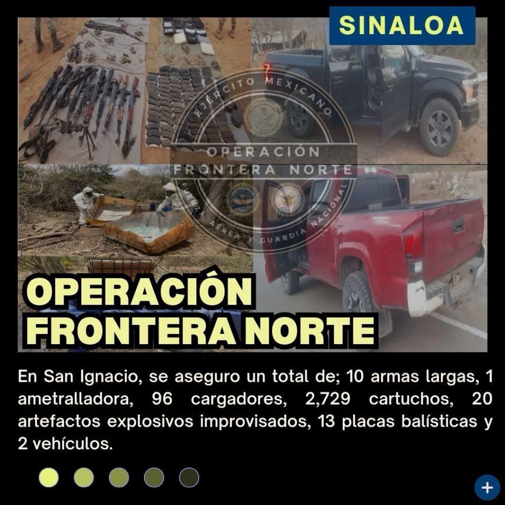-En Culiacán, personal del Ejército Mexicano, al realizar patrullajes de vigilancia, aseguró un arma larga, cargadores, cartuchos, 60 estrellas ponchallantas, tres vehículos y dos motocicletas.