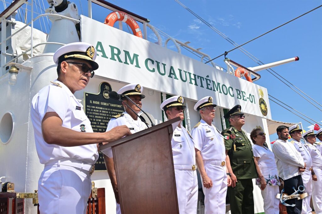 Por su parte, el Capitán de Navío Víctor Hugo Molina Pérez, Comandante del Buque Escuela “Cuauhtémoc”, informó que en esta ocasión 147 Cadetes de la Heroica Escuela Naval Militar se embarcan en el seno de este navío para efectuar el Crucero de Instrucción «Consolidación de la Independencia de México 2025», en conmemoración de aquella histórica acción donde el personal de la Armada de México expulsó el último reducto español de tierras mexicanas, consolidando así nuestra Independencia y marcando el inicio de una nueva era nación desde el mar.
