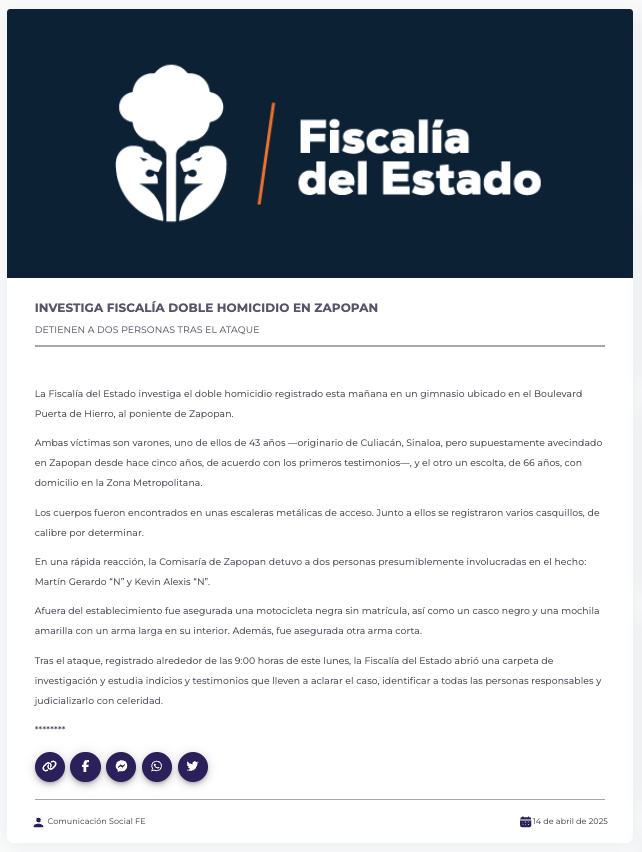En una acción coordinada y rápida, la Comisaría de Zapopan logró la detención de dos personas que se presume están involucradas en este hecho violento. Los detenidos fueron identificados como Martín Gerardo “N” y Kevin Alexis “N”, según informó la Fiscalía a través de un comunicado oficial.