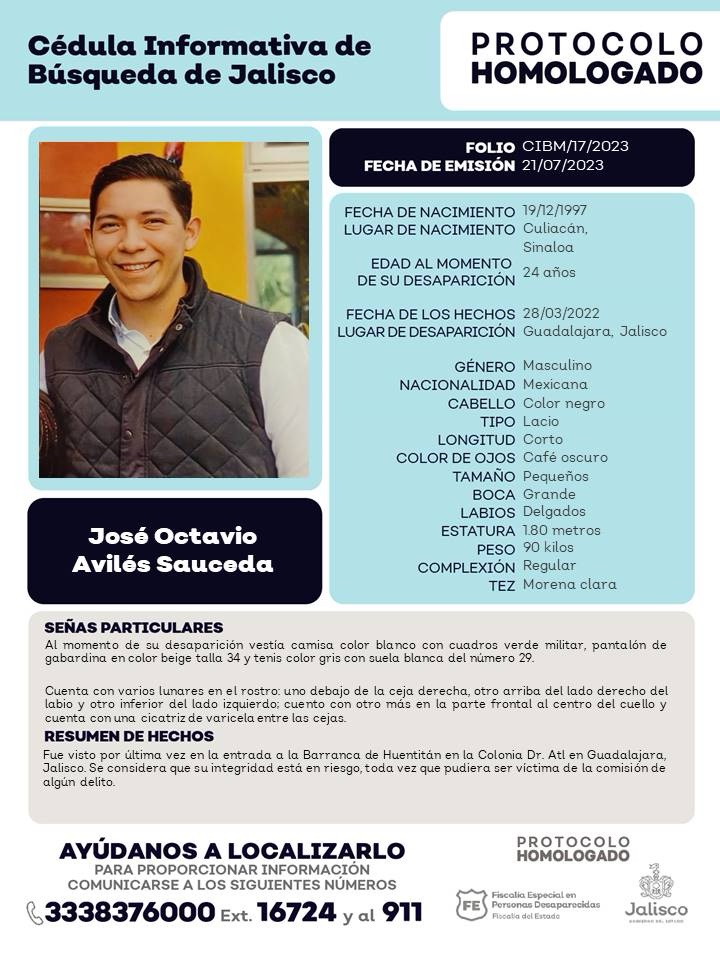 Trascendió que familiares de José Octavio Avilés fueron contactados ante el hallazgo, pues el joven sinaloense desapareció el 28 de marzo de 2022 en la Barranca de Huentitán, y hoy, después de tres años, no se ha confirmado su hallazgo.