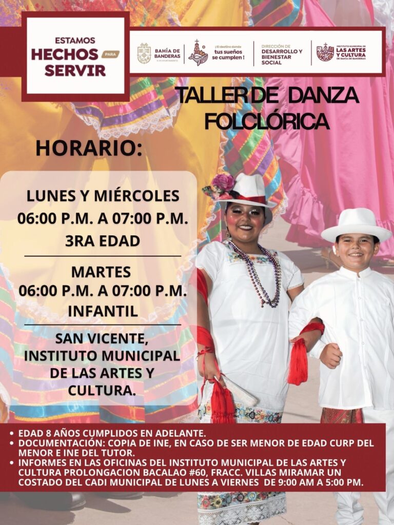 Entre los talleres disponibles se encuentran danza folclórica, música (guitarra y piano) , teatro y danza polinesia, dirigidos a niñas, niños, jóvenes y adultos. Los talleres se realizan en diversas sedes como lo son San Vicente, Valle Dorado, Villas Miramar, San José del Valle, San Juan de Abajo y La Cruz de Huanacaxtle, con horarios adaptados a distintos grupos de edad.
