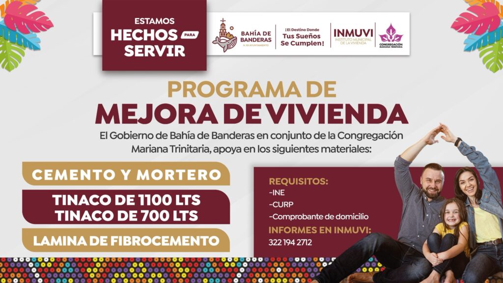 Con el firme compromiso de seguir impulsando acciones que mejoren la calidad de vida de las familias del municipio, el Gobierno de Bahía de Banderas, a través del Instituto Municipal de la Vivienda (INMUVI) y en coordinación con la Congregación Mariana Trinitaria, ha dado inicio al Programa de Mejora de Vivienda.