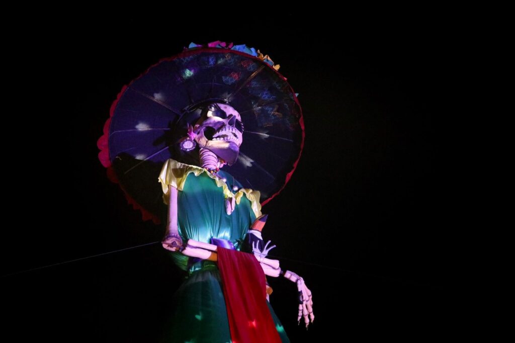 Es la cuarta edición de la catrina más grande del mundo y este año está hecha de fibra de vidrio con su indumentaria de tela, creada por el artista de Zapotlanejo, Jalisco, Juan Ernesto Navarro Salcedo, director general de Costumbres y Tradiciones Vivas.