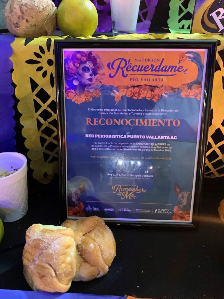 • La Red Periodística Puerto Vallarta recibió un reconocimiento por su participación por primera vez en el altar dedicado a los periodistas fallecidos, y contribuir a la preservación de las tradiciones mexicanas.