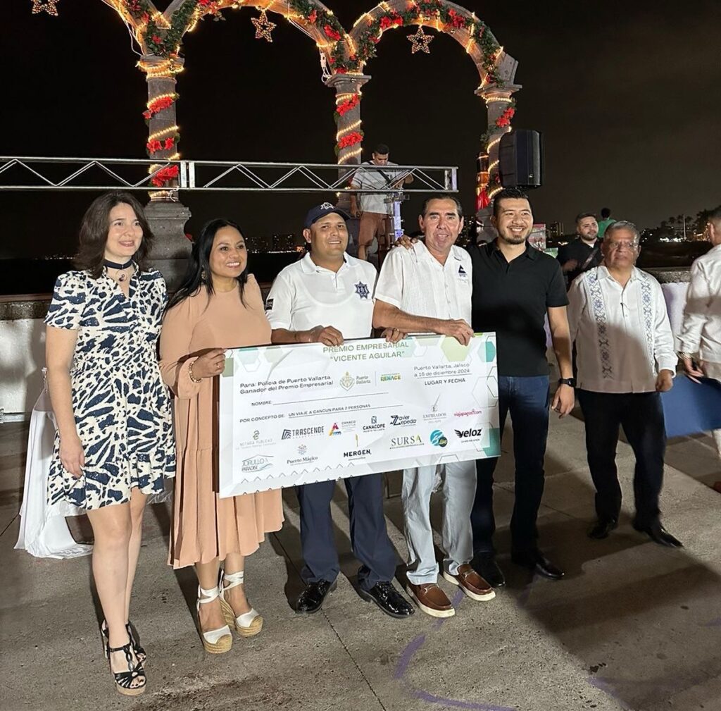 En los arcos del Malecón fue la entrega del Premio Empresarial a la seguridad social, por el sector empresarial representado por Canacope SERVYTUR Puerto Vallarta Bahía de Banderas, que otorgó a elementos de la dirección de Seguridad Ciudadana y Vialidad Municipal, como premio un viaje a Cancún todo incluido para 2 personas, más dinero en efectivo.