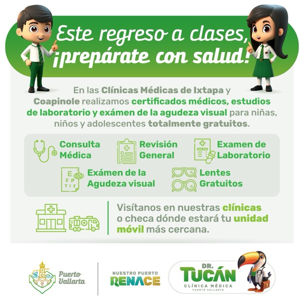 Con el nuevo ciclo escolar a punto de comenzar, el gobierno de Luis Munguía, a través de las Clínicas Médicas del Dr. Tucán, puso en marcha la campaña “Regresa a clases con salud y el Dr. Tucán”, para apoyar a las familias vallartenses con la entrega totalmente gratuita de certificados médicos escolares, además de estudios y revisiones esenciales para niñas, niños y adolescentes.