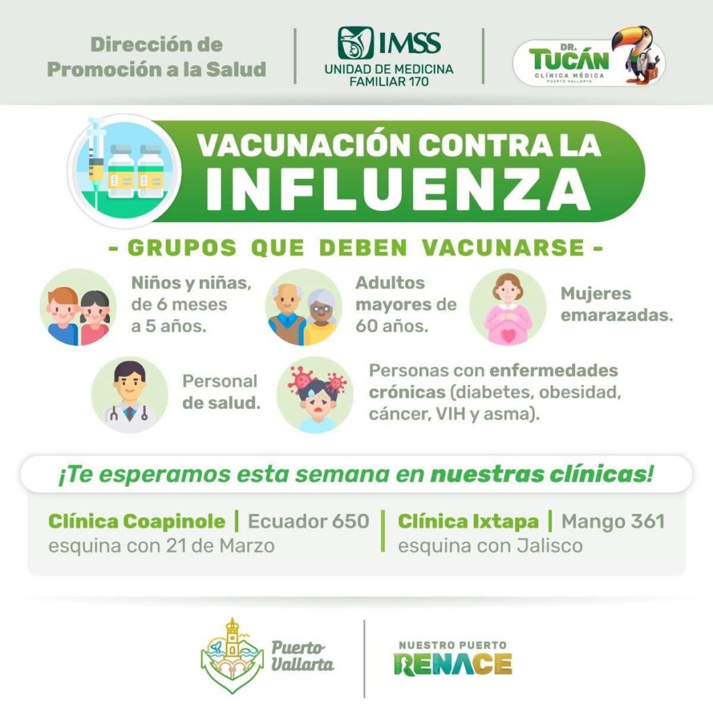 La Dirección de Promoción de la Salud de Puerto Vallarta, encabezada por el doctor Miguel Ángel Suárez, invita a la población a acudir a las clínicas Dr. Tucán para aplicarse la vacuna contra la influenza, una medida preventiva que ayuda a evitar complicaciones respiratorias y proteger la salud de las familias vallartenses, como parte de las acciones que impulsa el gobierno de Luis Munguía González.